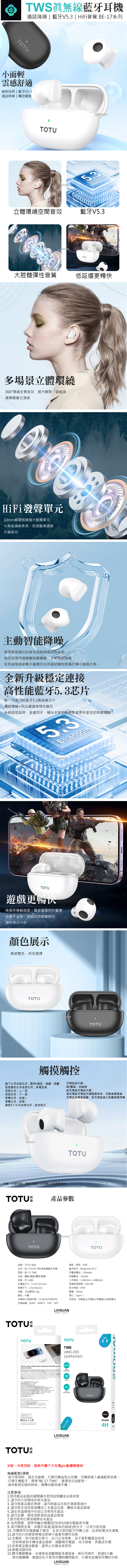 ※第一次使用時,請先將耳機下方充電pin點膠膜撕掉後,將耳機放入充電盒充飽電無線配對/清除‧首次使用時,請先充飽電,打開耳機盒取出耳機,耳機將進入廣播配對狀態。‧打開手機藍牙,搜尋"BE-17-TWS",選擇並完成配對。‧當有配對記錄的時候,開機自動回連手機。注意事項1.使用產品前請詳細閱讀本使用說明書並妥善保管2. 請勿自行拆開或改裝本產品3. 請勿將產品靠近熱源,請勿將產品存放於潮濕環境中4. 請勿將水或其他液體流入本產品內部,導致本產品損壞5. 請在常溫環境中存放以及使用本產品6. 請勿丟擲,避免因跌落造成產品損壞7.請勿使用化學溶劑擦拭本產品8. 如有需要,請使用輸出電壓DC5V的USB充電器來充電9. 請勿隨意丟棄,或置於高溫(溫度高於60度)與火中,以免引起危險10. 耳機使用充電鋰離子電池,在首次使用藍牙耳機之前,必須給電池充滿電11.請勿自行拆解更換電池更換不當會有爆炸危險12.充電時,有可能產生熱力,此乃正常現象,並不會影響產品表現,但如果感到手機或產品過熱,請斷開充電器,待冷卻後,再嘗試充電13.如果產品電池膨脹,請停止充電或者使用14.廢電池請回收15.雙耳機開機後,未連接或者斷開藍芽連接後,無任何操作,超過5分鐘將自動關機,建議您在不使用耳機時關閉藍芽,以避免設備和耳機的功耗常見問題:問題1. 產品無法與我的手機配件?1.請確認耳機處於配對模式2. 清除產品的配對歷史,接通電源,再次配對3. 清除手機的配對歷史,關閉藍牙,然後打開,再次配對問題2. 藍牙範圍或音質不好?1.藍牙信號會被周圍物體遮擋而影響音頻質量,如果產品與手機之間沒有障礙,音域和音質更好2.關掉周圍不必要的無線設備3.關掉手機後台運行的不必要的應用程序問題3. 為什麼會延遲?有一個數據傳輸過程從你的手機到產品,所以有時你會感到延遲,這是所有藍牙設備都存在的一個常見問題,而藍牙V5.3已經使其優於舊版本問題4. 為什麼充電盒不能給耳機充電?耳機放回充電盒後不能關機?1.如果充電盒沒有電,則出現上述問題,請給充電盒充電等有電後就會恢復正常2.請確保您的左右耳機沒有放在相對的位置