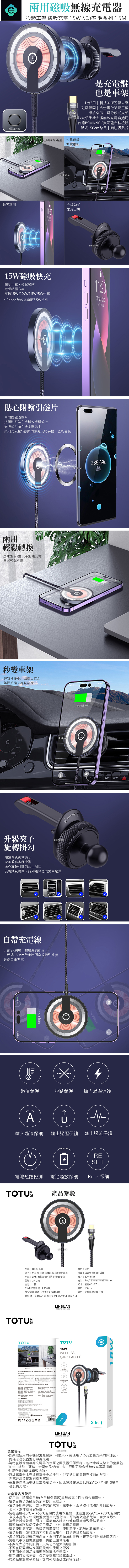 ●一機二用,是充電盤也是車架●科技美學透顯未來●磁吸穩固|合金鋼化玻璃工藝|導航必備|可分離式支架●一體式150cm線長|贈磁吸貼片●蘋果/安卓手機支援無線充電皆適用●咖噠一聲,輕鬆吸附15W快充定頻調壓方案●支援15W/10W/7.5W/5W快充●*iPhone無線充適配7.5W快充●內附贈磁吸墊片,透明貼紙貼在手機或手機殼上●磁吸墊片貼在透明貼紙上,讓沒有支援"磁吸"的無線充電手機,也能磁吸●兩用輕鬆轉換,居家辦公/邊玩手遊邊充電,質感輕鬆充電●輕鬆秒變車用出風口支架,無懼顛簸,導航必備●升級夾子旋轉掛勾,顛覆傳統夾式夾子●完美兼容多種車型,貼心旋轉可調勾式出風口●旋轉鎖緊穩固,找到適合您的愛車扇葉●升級SR網尾,耐磨編織線身●一體式150cm黃金比例拿捏恰到好處,輕鬆自由充電●9重保護,充電更安心●品牌:TOTU 拓途●系列:明系列-兩用磁吸出風口無線充電器●功能:磁吸/無線充電/可拆車架/自帶線●型號:CH-233●產地:中國●顏色:灰色●材質:鋁合金+玻璃+編織●輸入:20W Max●輸出:5W/7.5W/10W/15W Max●尺寸:直徑6.2x0.7cm●線長:150cm●適用:支援無線充電手機●BSMI認證字號:R45879●NCC認證字號:CCAJ23LP04B0T8●內容物:充電盤x1,出風口支架1,說明書x1,磁吸片x1